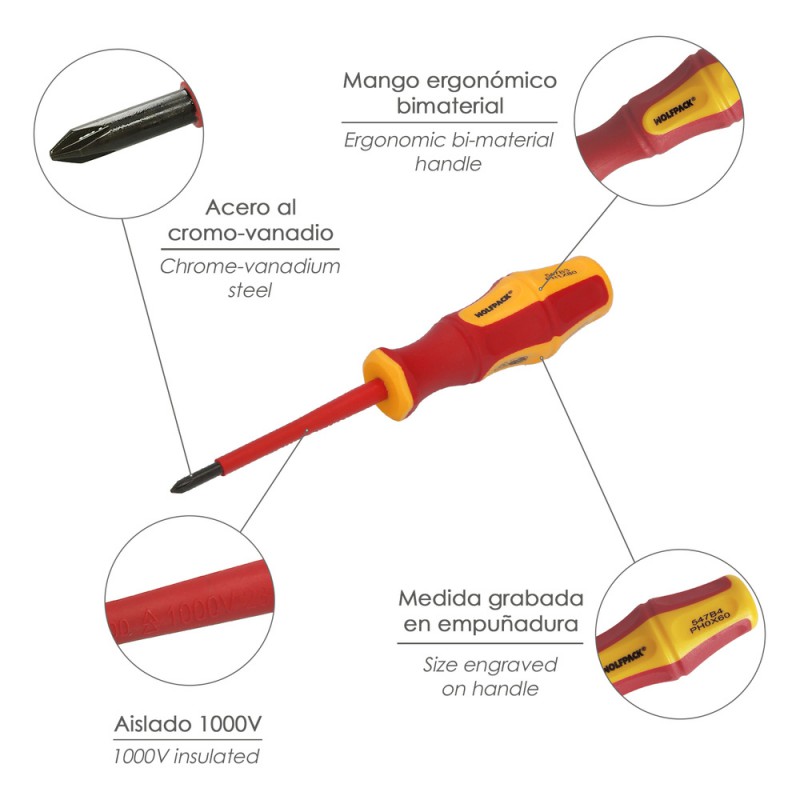 - Articulo conocido como destornillador Phillips, destornillador seguridad Phillips, destornillador electricista, destornillador seguridad electricidad, destornillador electricista.