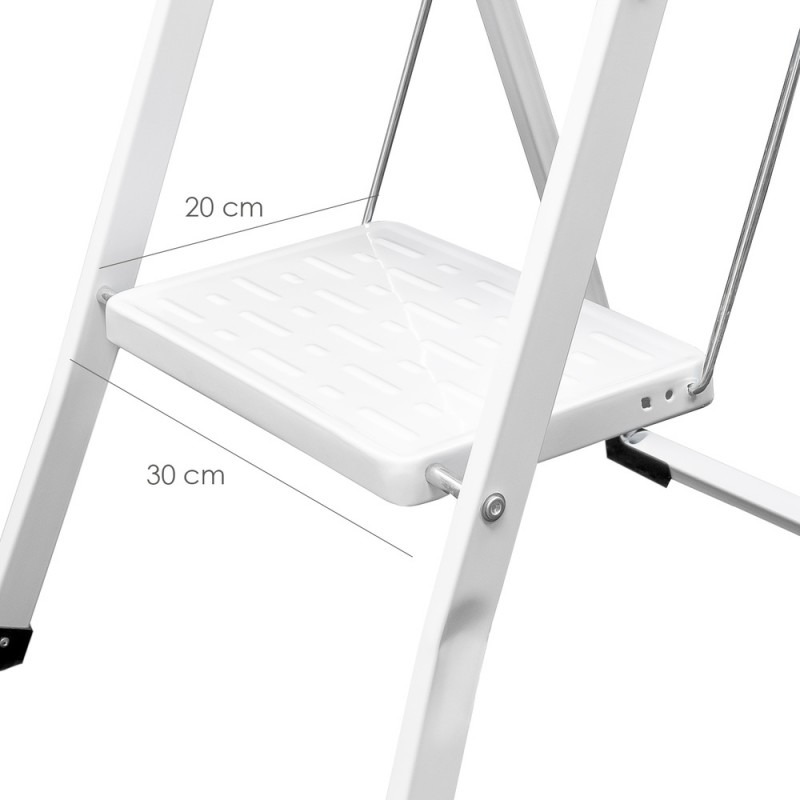 - Escalerilla fabricada en acero y color blanco, con 3 resistentes peldaños y patas de pvc antideslizantes para uso doméstico.