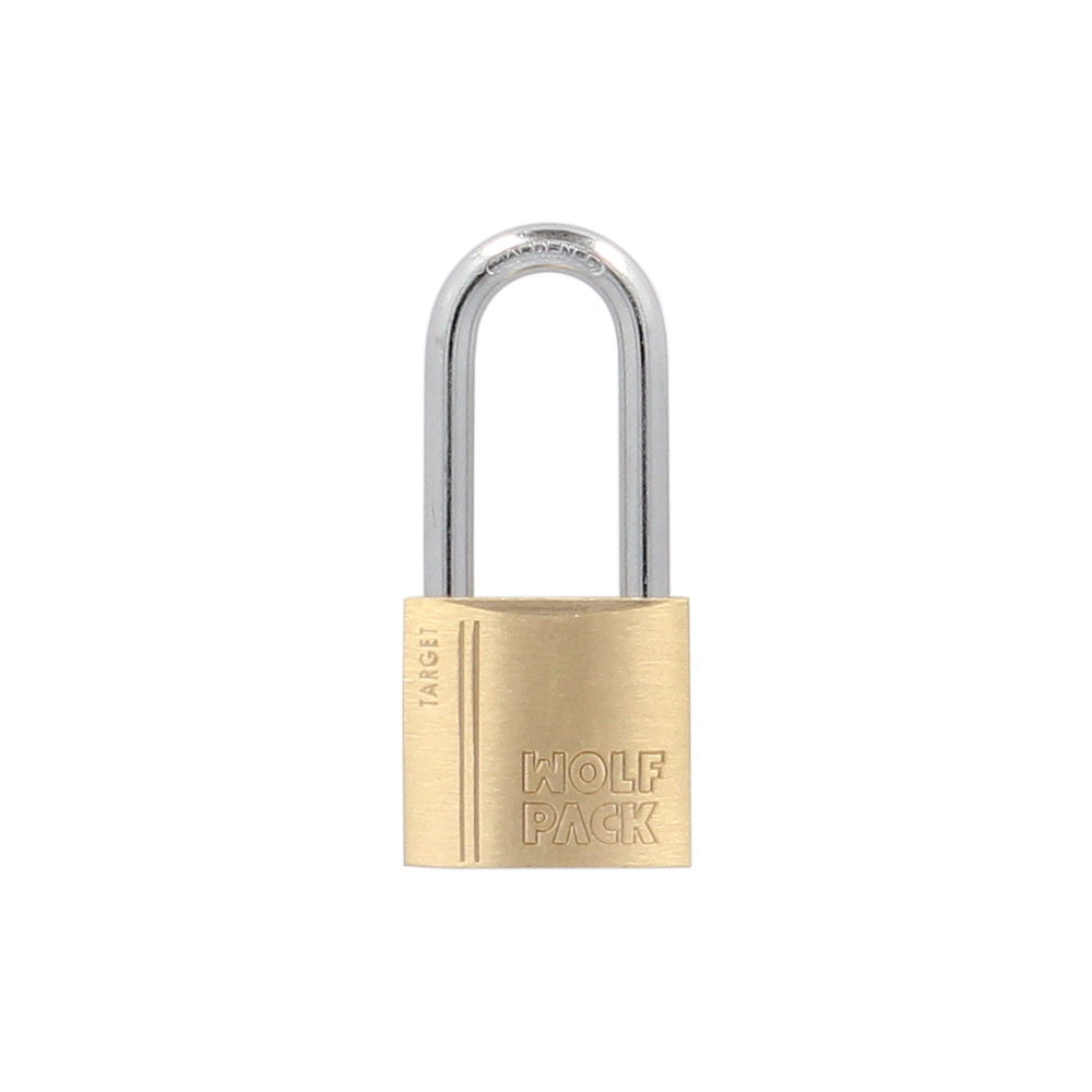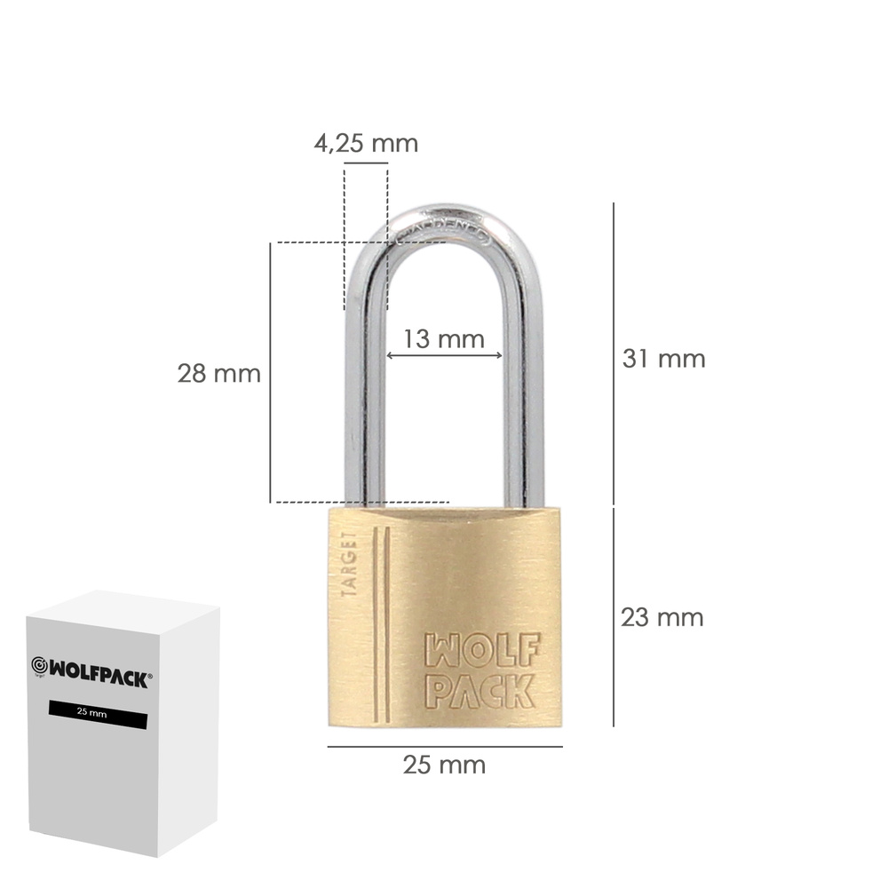 Candado Laton Arco Largo 25 mm.- Medidas: cuerpo: 25 mm. / Aro de cierre: ø 4,25 mm. / Altura del cierre: 31 mm.