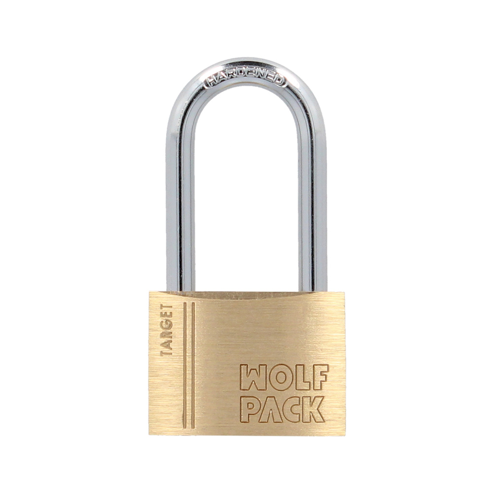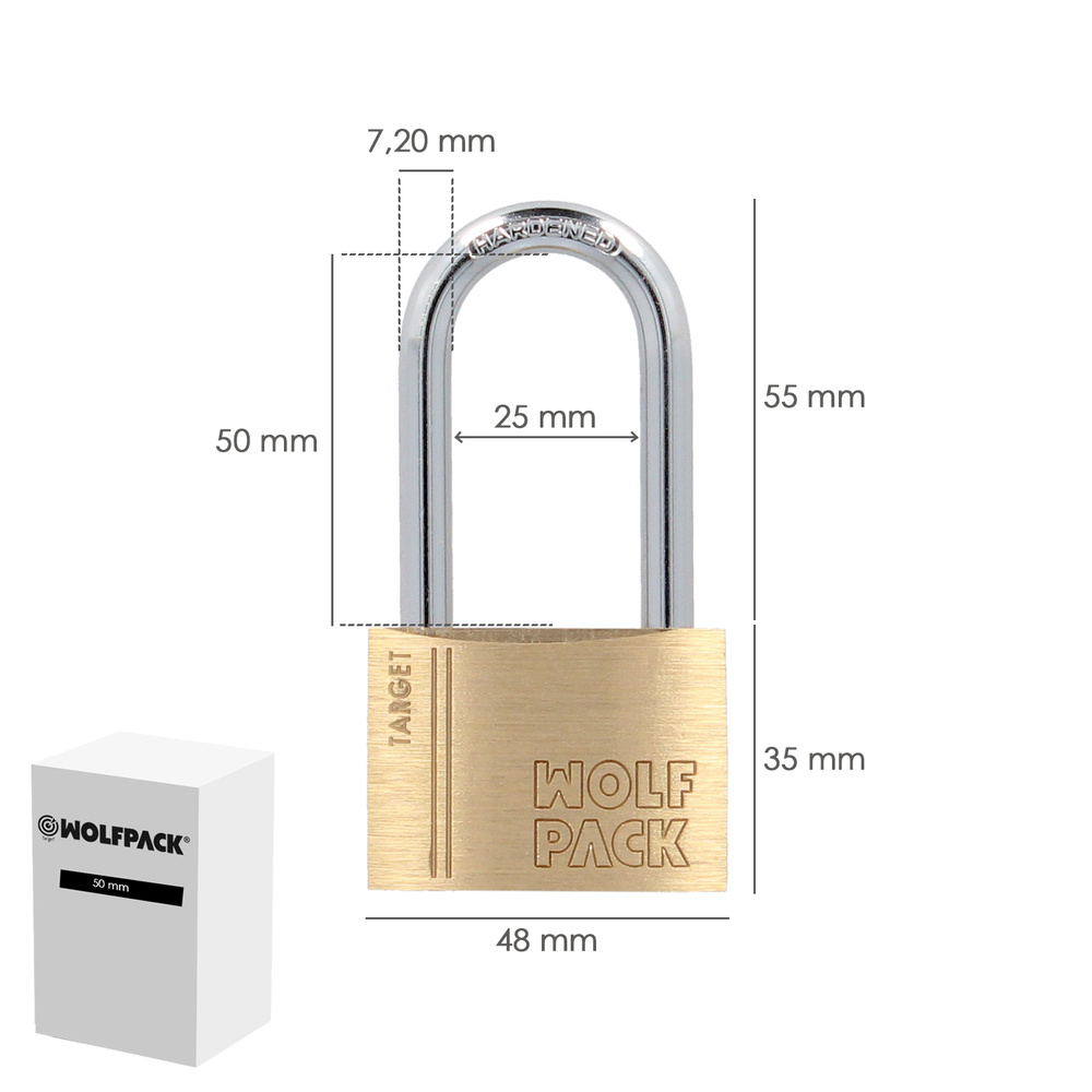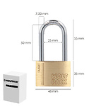 Candado Laton Arco Largo 50 mm.- Medidas: cuerpo: 48 mm. / Aro de cierre: ø 7,20 mm. / Altura del cierre: 55 mm.