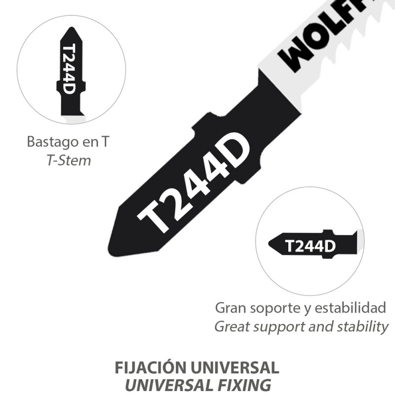 - Vastago en forma de T, compatible con la mayoría de modelos de sierra de calar.