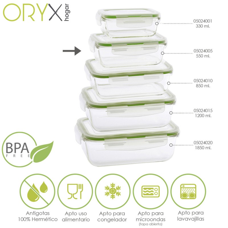 - Recipientes herméticos para una mejor conservación y un transporte sin derrames, no conserva olor ni sabor de alimentos contenidos anteriormente. Las tapas cuentan con un sistema de 4 cierres de bloqueo además están realizadas en silicona inyectada que se adhiere al cristal aislando los alimentos de gérmenes y olores externos y favoreciendo su perfecta conservación.
