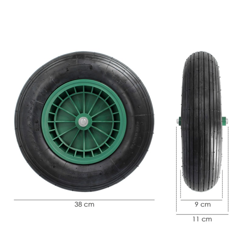 - Con un diámetro de 38 cm, esta rueda está diseñada para proporcionar estabilidad y rendimiento óptimo en carretillas de obra y jardín.