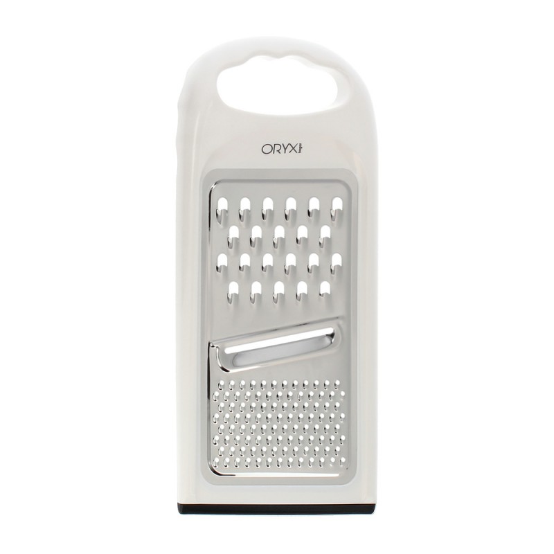 - Rallador de acero inoxidable con cuerpo de plástico blanco ABS y base antideslizante.