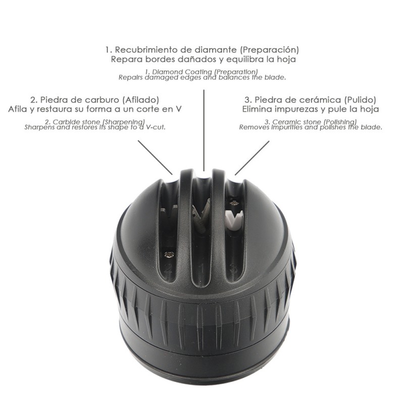 - Afilador de ventosa de 3 etapas de nueva generación, que gracias a su potente ventosa, permite estar fijo mientras se realiza el afilado.