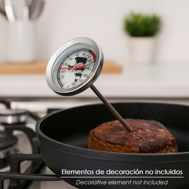 - Este termómetro, resistente hasta los 120ºC, es tu aliado en la cocina gracias a su fabricación en acero inoxidable de alta calidad.